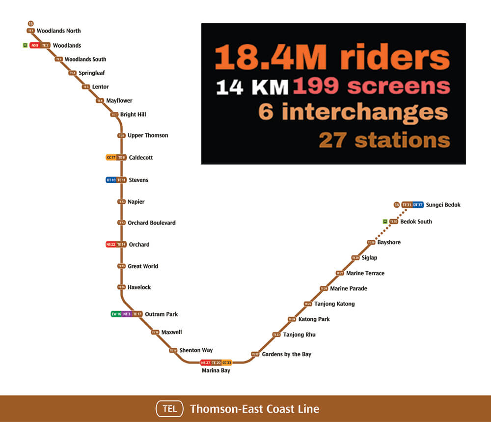 Asiaray manages the advertising spaces on the Thomson–East Coast Line (TEL).